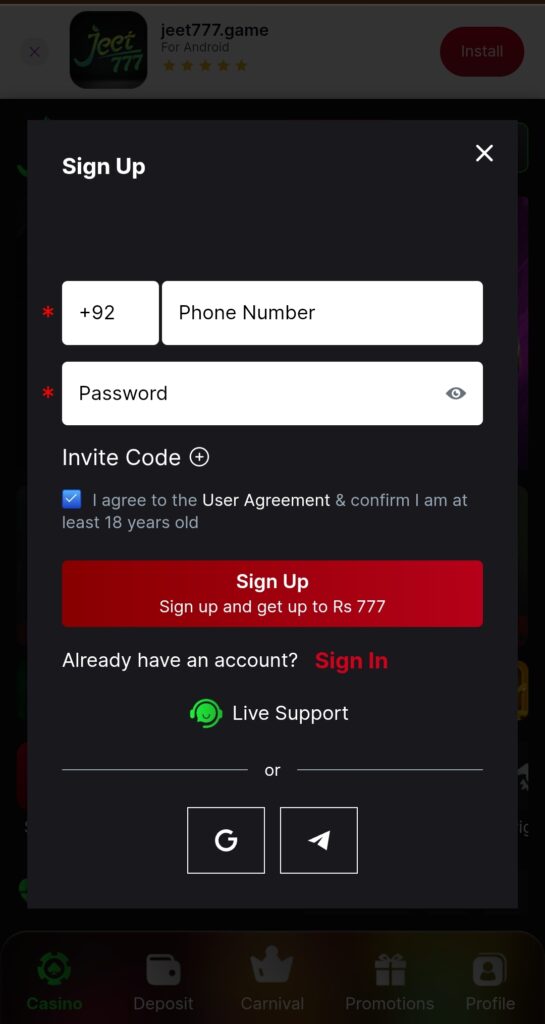 Open the Jeet 777 Game App: When you launch the app for the first time, you’ll be prompted as “Sign Up”. select Register an Account and fill the following details: